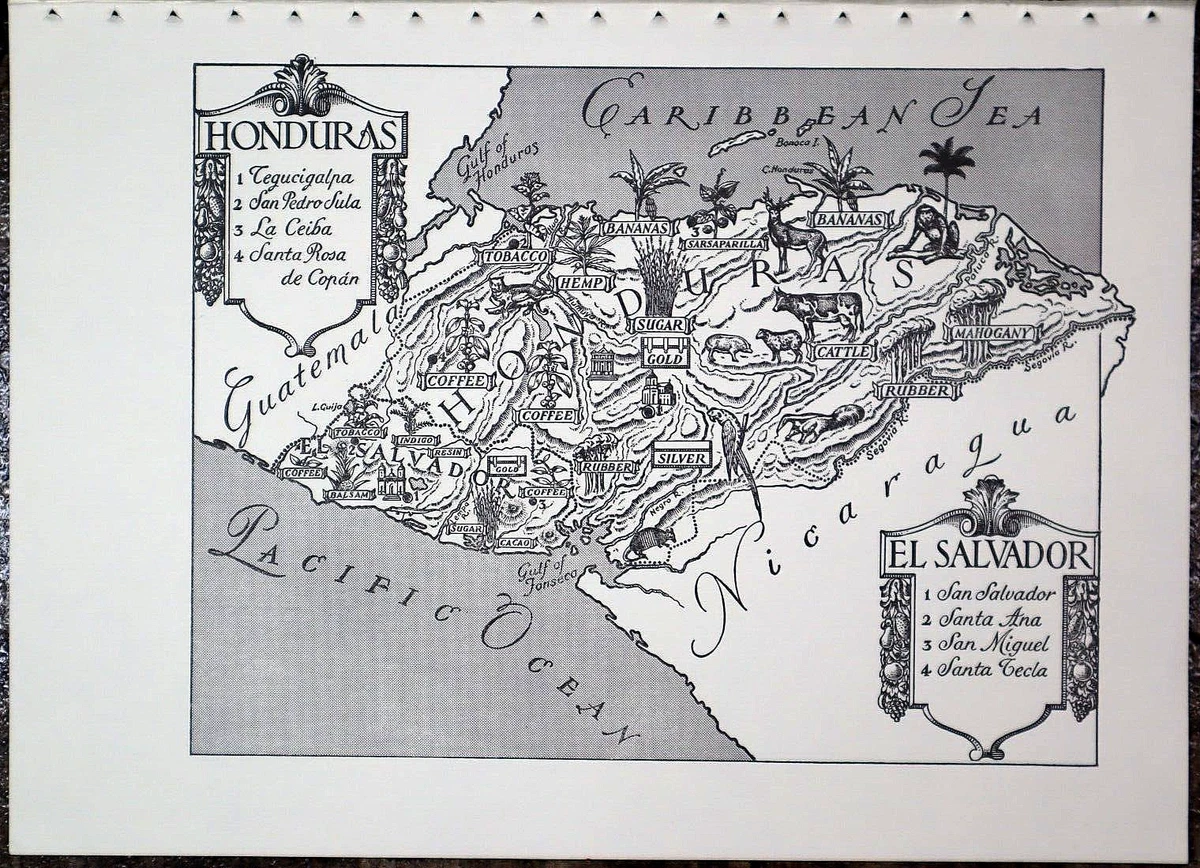 1943 Vernon Quinn Pictorial Map ~ EL SALVADOR & HONDURAS ~ Maps by